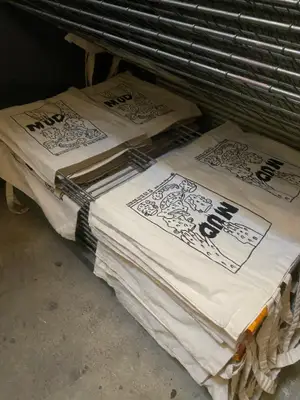 L'atelier MUD a de nouveaux sacs dessinés et sérigraphiés par moi même à distribuer à ses nombreux mécènes. J'ai eu plaisir à être formé à la sérigraphie par une résidente du Préavie